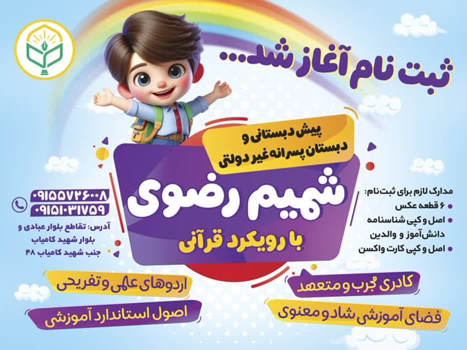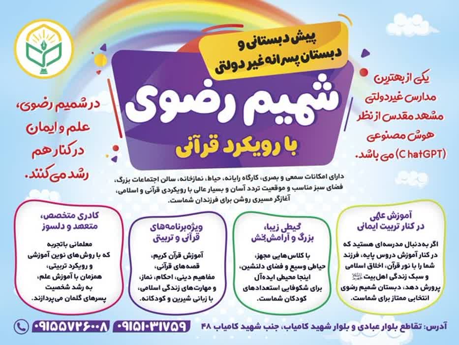 پیش دبستانی و دبستان پسرانه شمیم رضوی به عنوان یکی از مدارس ابتدایی سرشناس در منطقه شناخته میشود. ما برای دانش آموزان خود فضایی دوستانه، امن و آموزنده فراهم میکنیم تا هر دانش آموز به صورت جداگانه تشویق و هدایت شده و به رشد و پیشرفت دست یابد. منتظر دیدار شما هستیم.